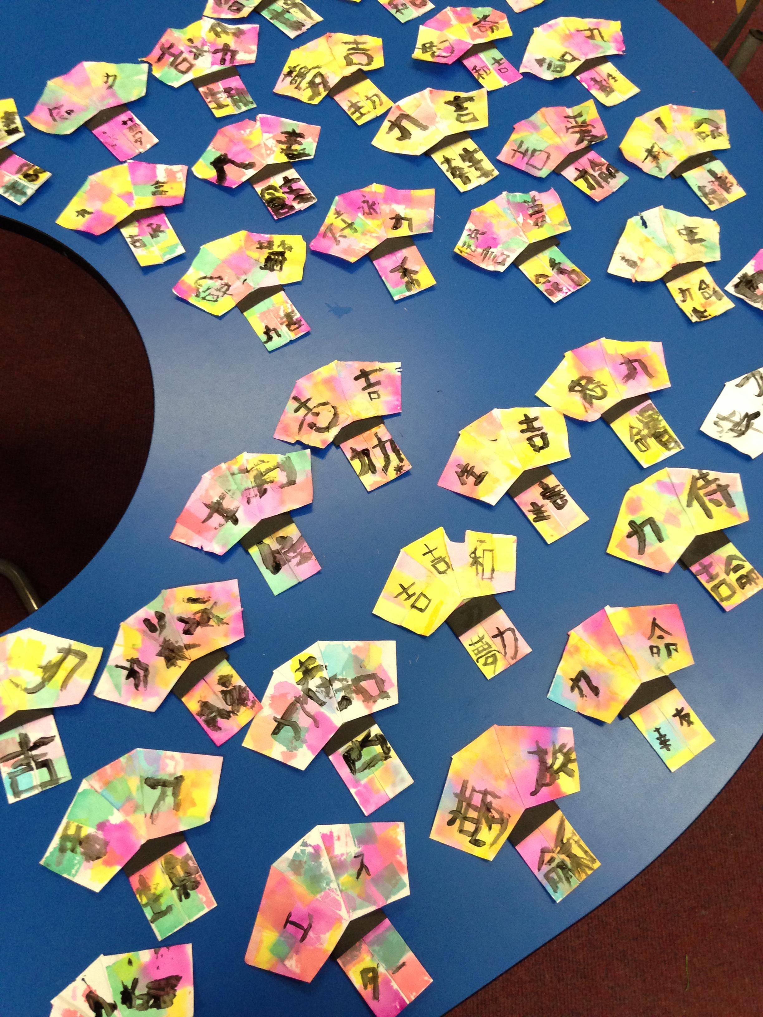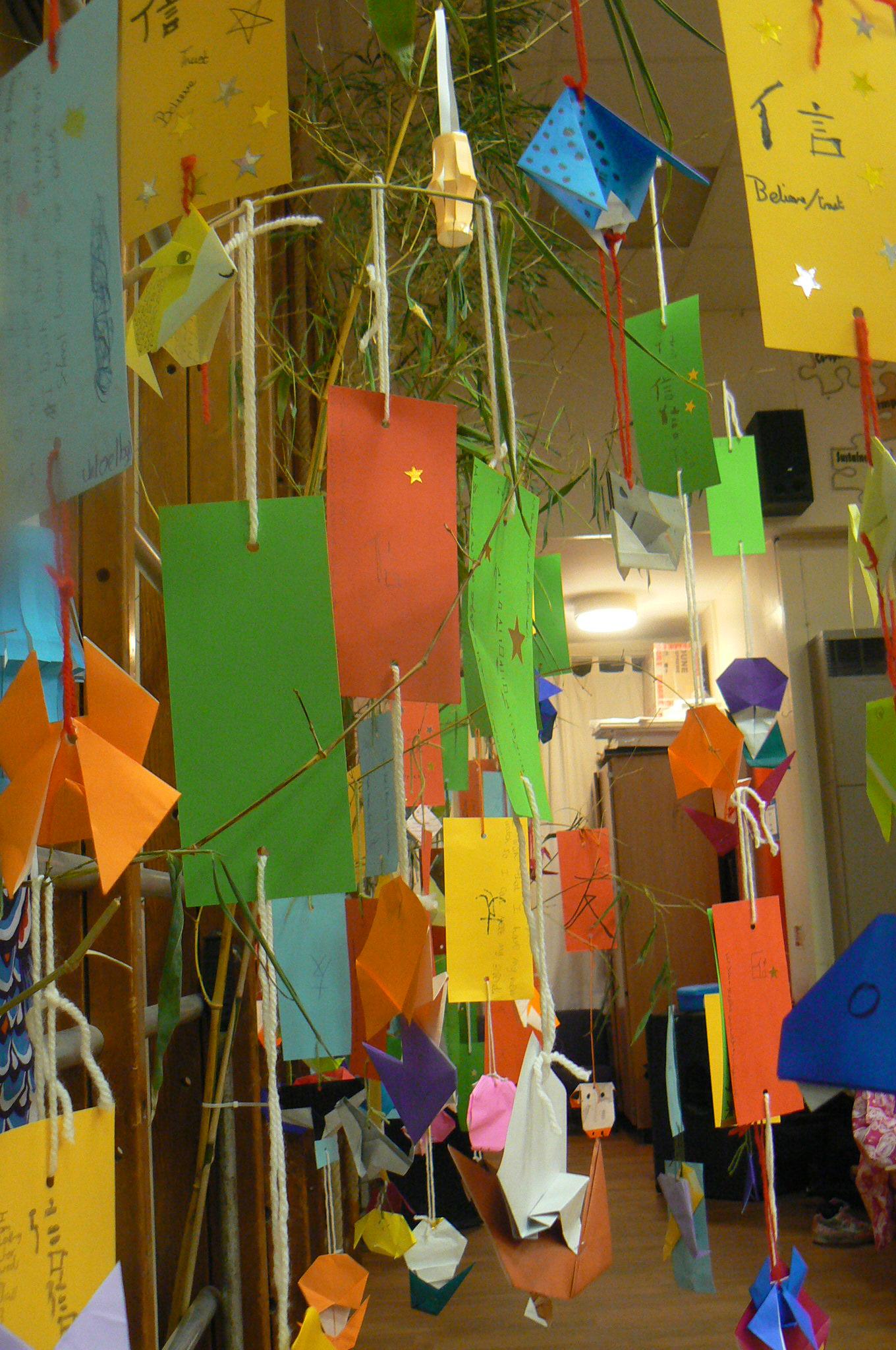 After assembly, each class started to make their tanzaku. First, they copied the Japanese symbols for harmony, friendship or trust on their cards - these are some of our school values. Next, they wrote their wish for the next academic year on the back. Finally, they added origami to the bottom - each class did a different origami animal. Before long, the bamboo in the hall was full of multi-coloured wishes.