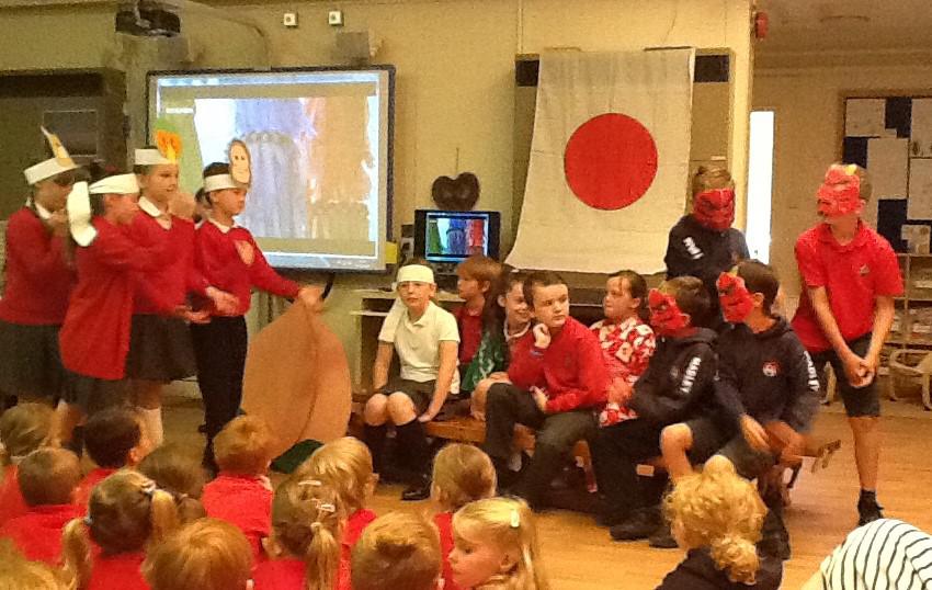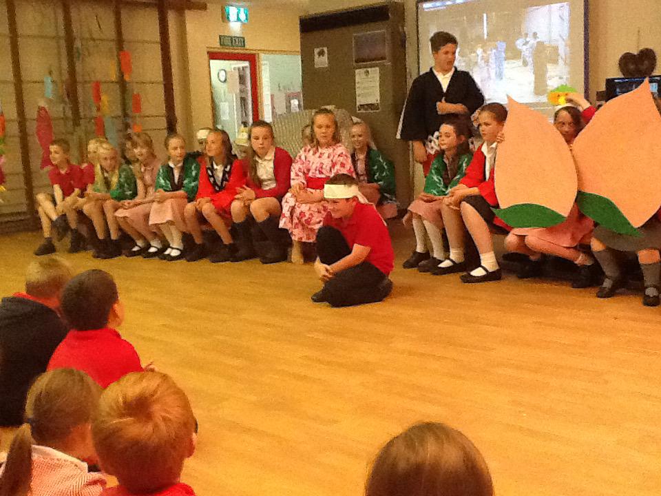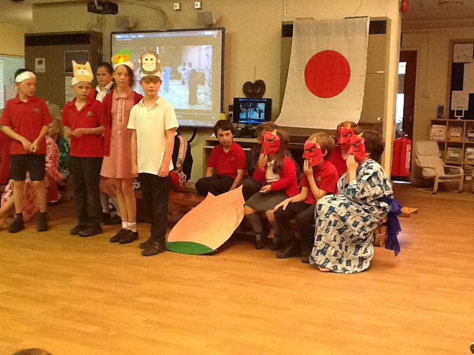 Towards the end of the afternoon, we gathered in the hall again. This time, Class 5 performed the Momotaro (Peach Boy) play, but first it was the turn of the children who attend the Year 2 Japanese Club to dance to Sakura in their summer kimonos with fans they had designed. What a wonderful festival!