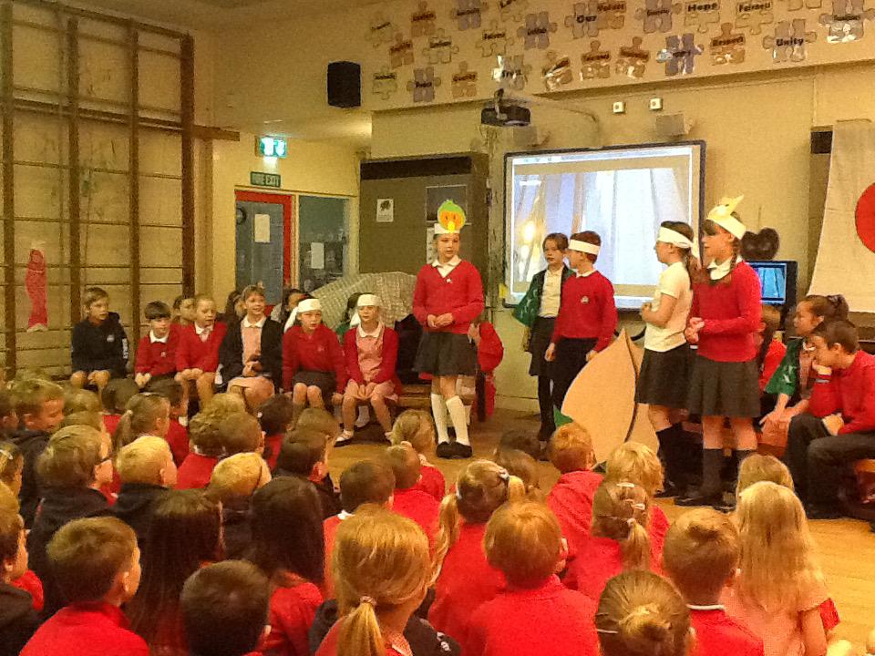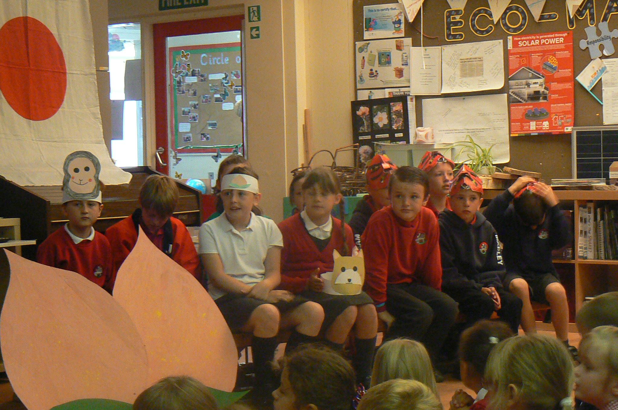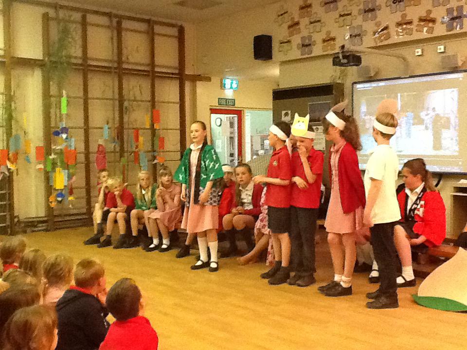 The day started with a performance of the Gigantic Turnip in Japanese (Ookii Kabu) by Class 3. Nancy, Derran and Isabelle then told the story of Tanabata (see below for the clip that they used) and Mrs Morris explained about the wish cards (tanzaku) that Japanese children make. Every child in the school would make a tanzaku and hang them on the bamboo in the hall - it looked amazing by the end of the day! Next, Class 4 performed the traditional story of Momotaro (Peach Boy) in Japanese and English, a play written by us with the help of Mrs Terry.