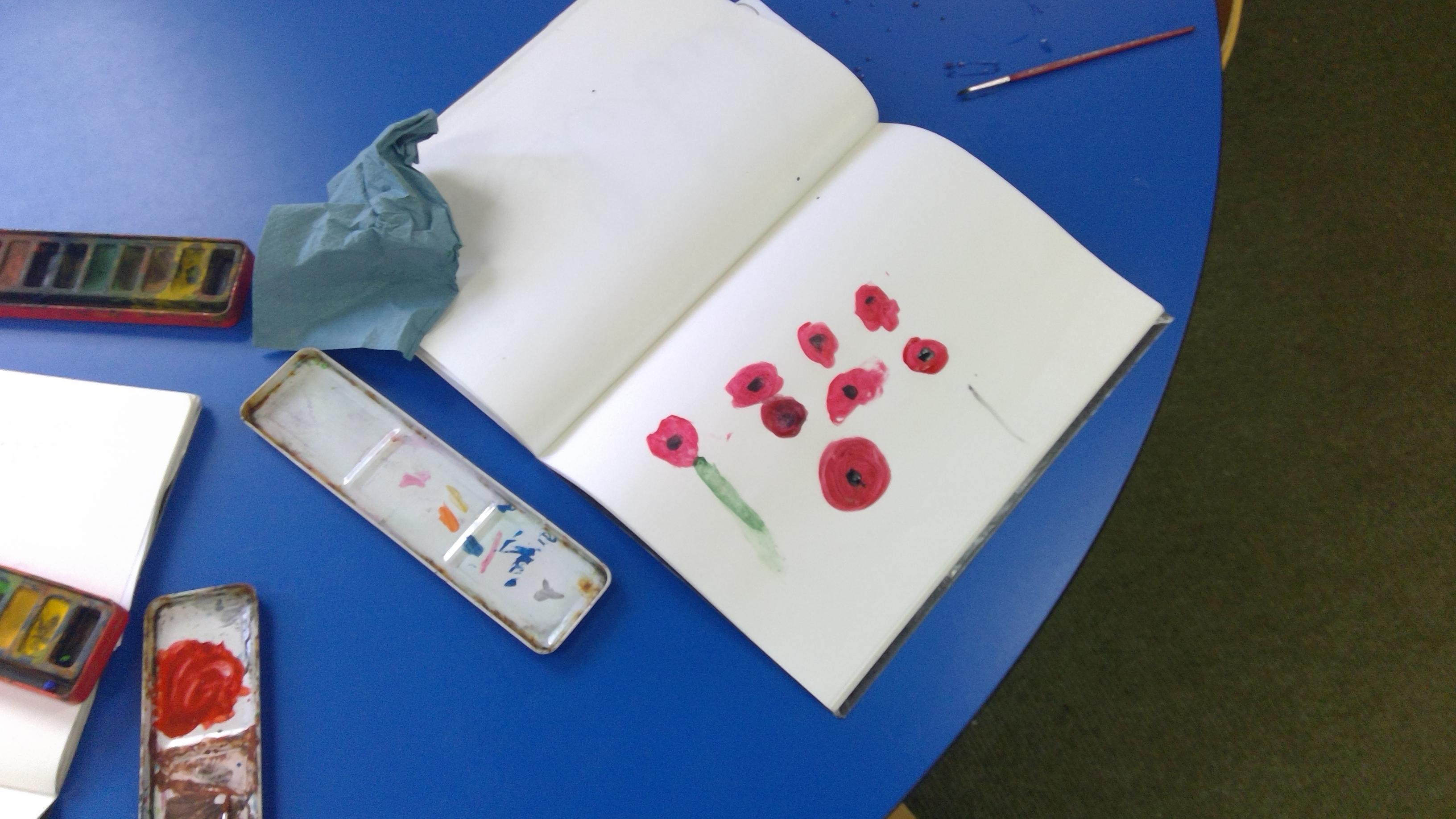 Experimenting with water colours to create poppies